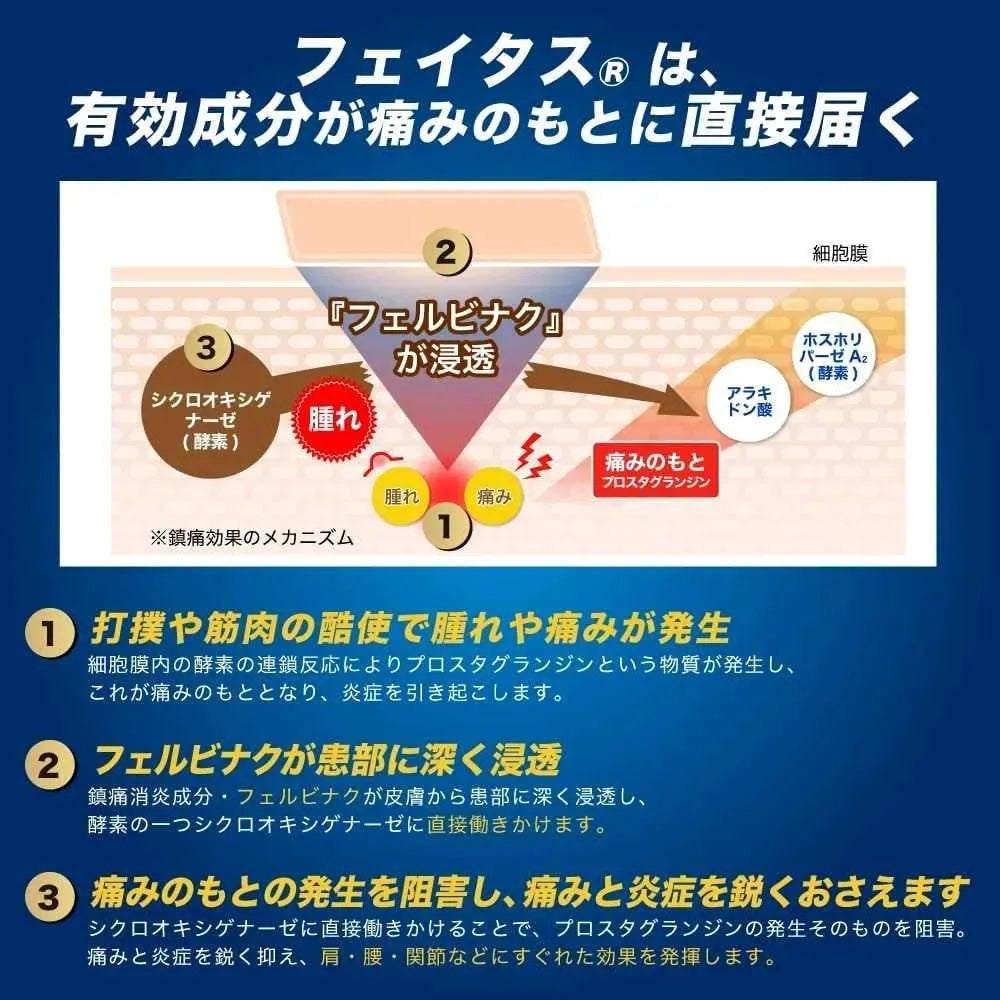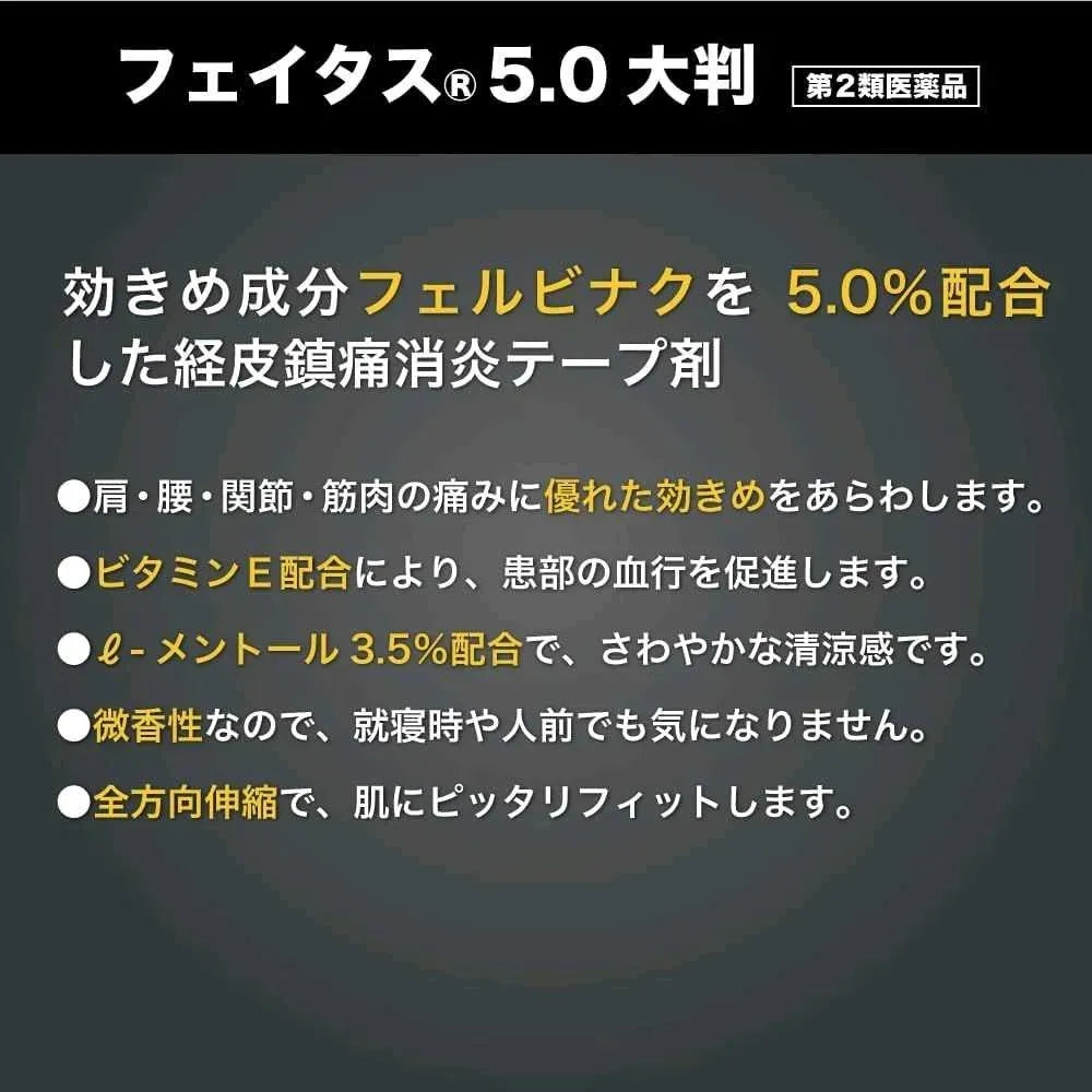 Experimenta el máximo alivio del dolor con Hisamitsu Feitas 5.0, el parche japonés de alta eficacia que actúa directamente sobre el origen del malestar muscular y articular.