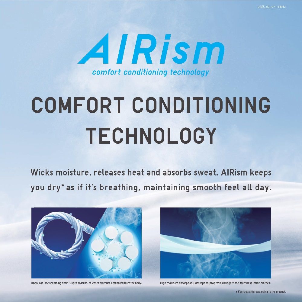 AIRism es una tecnología textil japonesa diseñada para ofrecer máxima frescura y comodidad en el uso diario. Sus tejidos avanzados regulan la temperatura corporal, absorben y expulsan la humedad rápidamente y secan con gran rapidez, manteniendo la piel fresca y seca incluso en climas cálidos o durante la actividad física. Además, AIRism destaca por su textura ultra suave, ligereza y alta transpirabilidad, convirtiéndose en la opción ideal para ropa interior, camisetas y prendas base de uso diario.